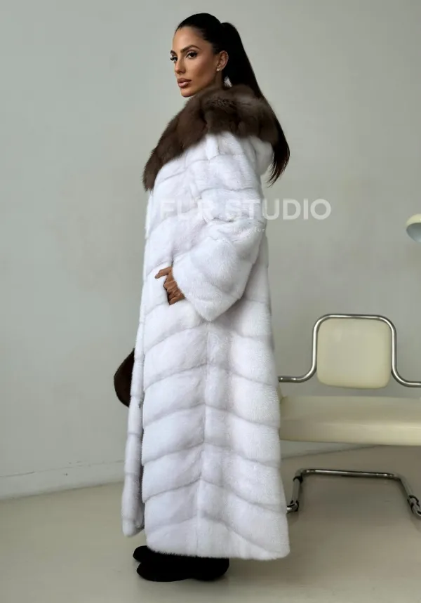 Белая норковая шуба с куницей капюшон 102390