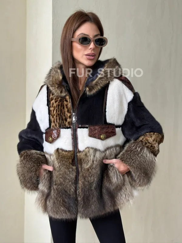 Комбинированная норковая куртка с капюшоном 100725