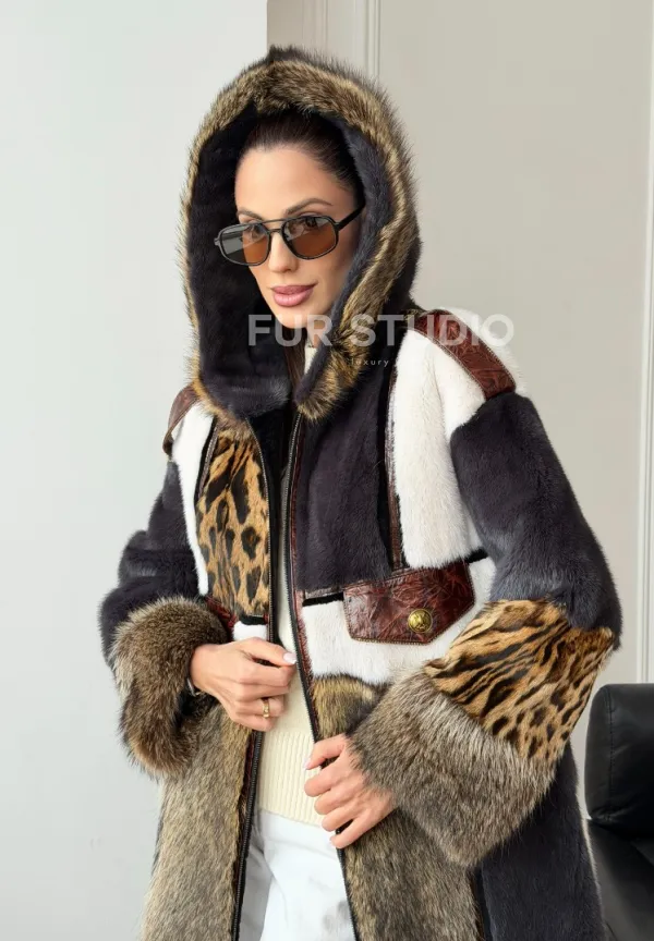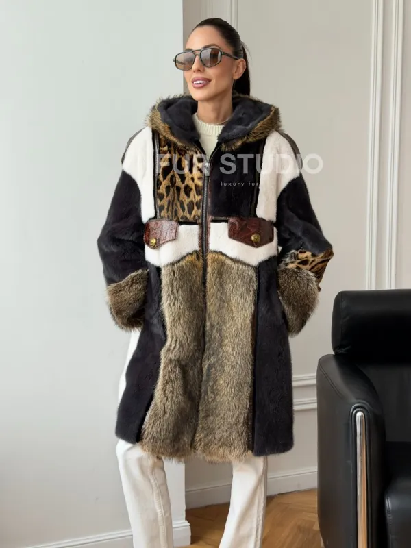 Комбинированная норковая шуба с капюшоном доступна для покупки в нашем шоуруме Furs Studio в . У нас так же есть доставка во все города России. Добавьте немного роскоши в свой гардероб с этой шубой, которая будет служить вам многие годы.