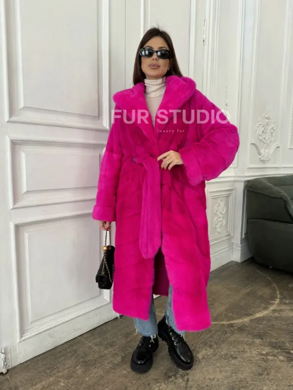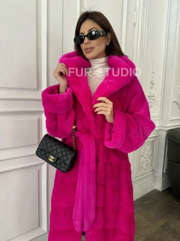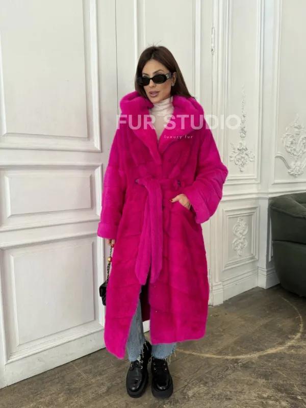 Мех данной шубы аукционная норка, цвет розовый. Предлагается в размерах от 42 до 50. Длина модели 120-125 см, что выгодно подчеркивает фигуру девушек. Эта модель идеально подойдет для девушек и женщин, предпочитающих роскошные натуральные меха.