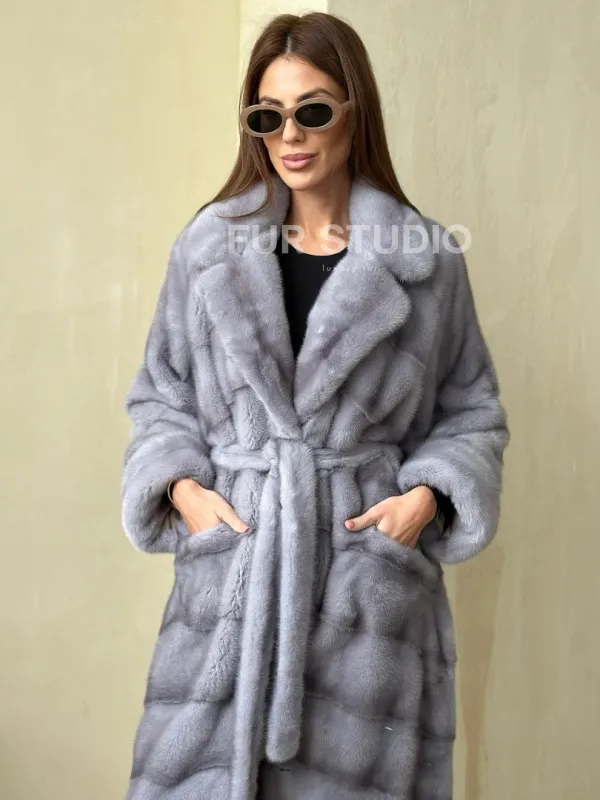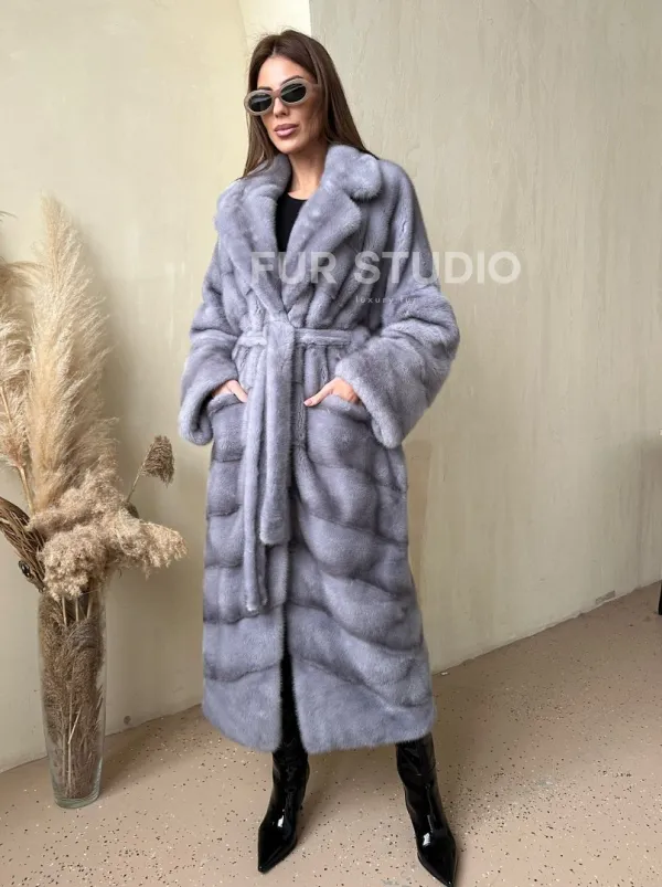 Мех данной шубы аукционная норка , цвет голубой. Предлагается в размерах от 42 до 50. Длина модели 115-120 см, что выгодно подчеркивает фигуру девушек. Эта модель идеально подойдет для девушек и женщин, предпочитающих роскошные натуральные меха.