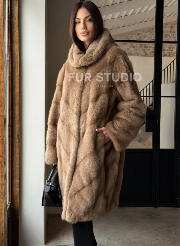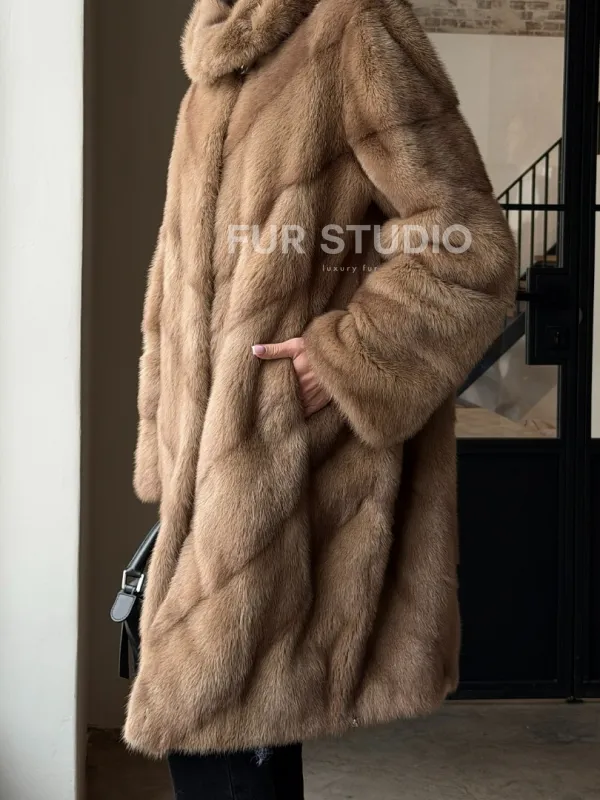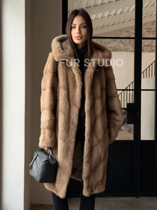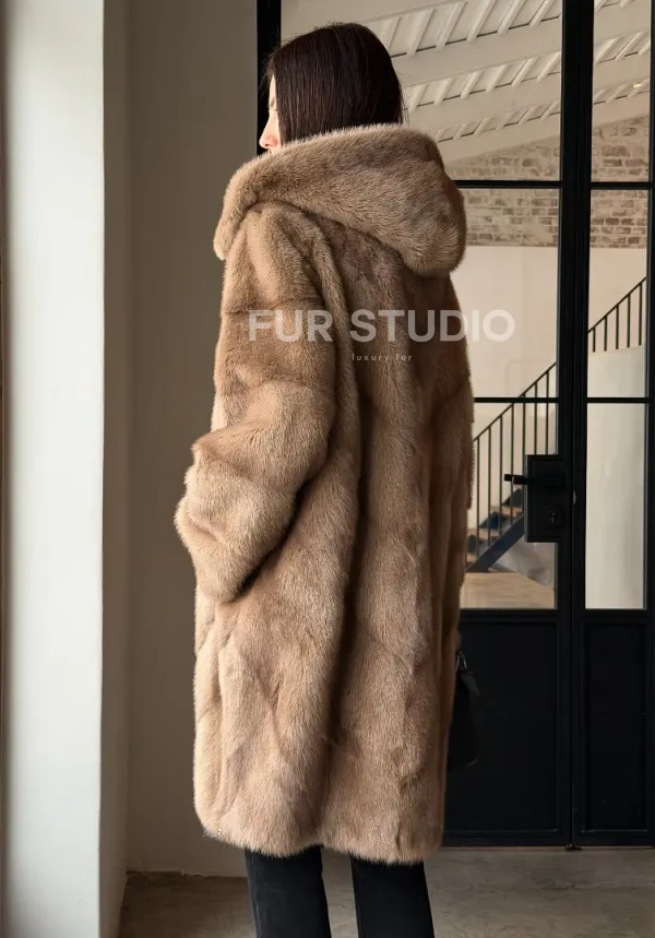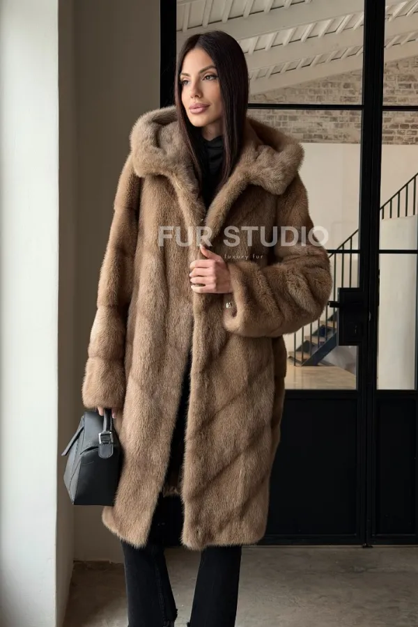 Норковая шуба с капюшоном - цвет пастель 100849