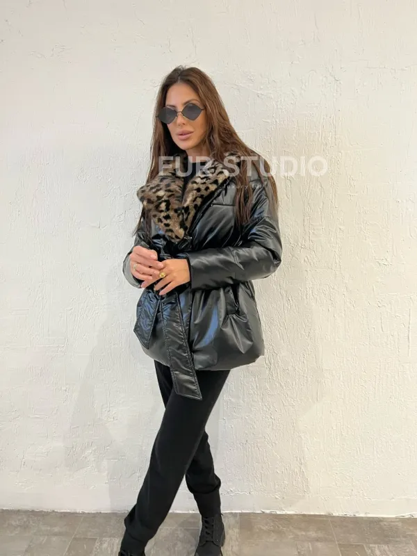 Пуховик с мехом норки в анималистическом принте 100391