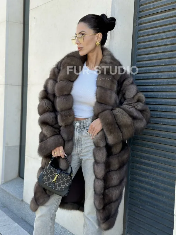 Легкая и стильная шуба из темного меха баргузинского соболя в длине миди — выбор деловых и активных женщин. Эта модель отлично подходит тем, кто ездит за рулем, но также и для любительниц прогуливаться пешком в любую погоду.