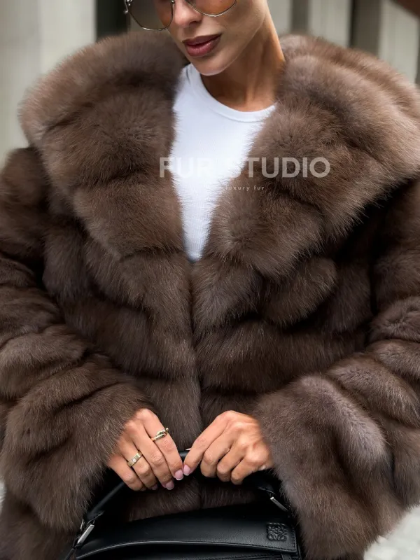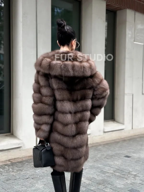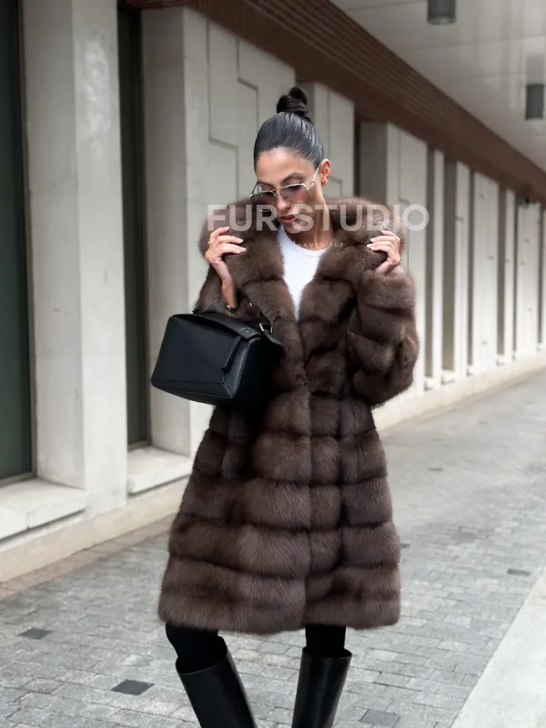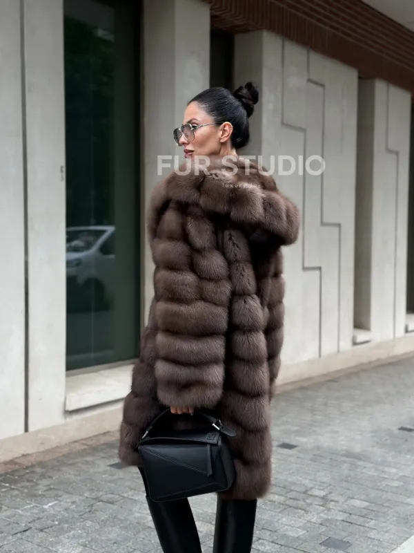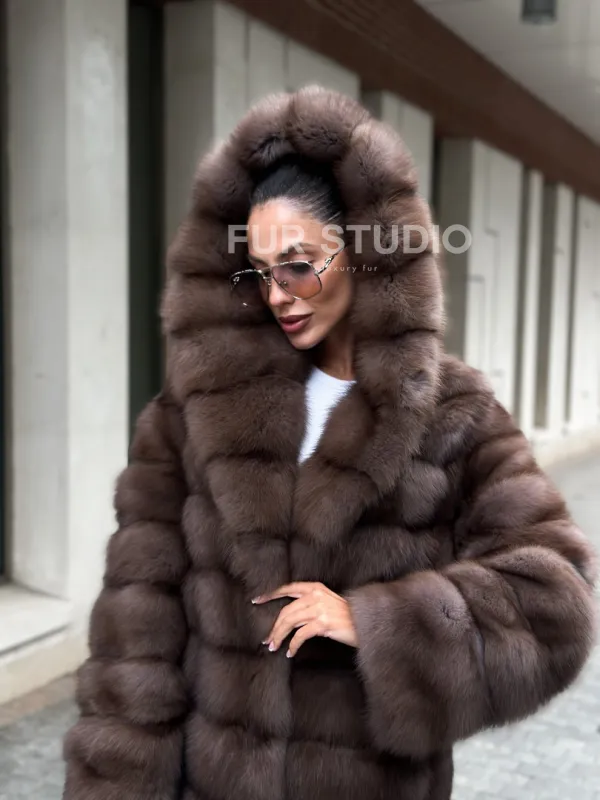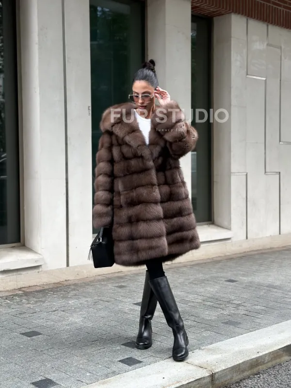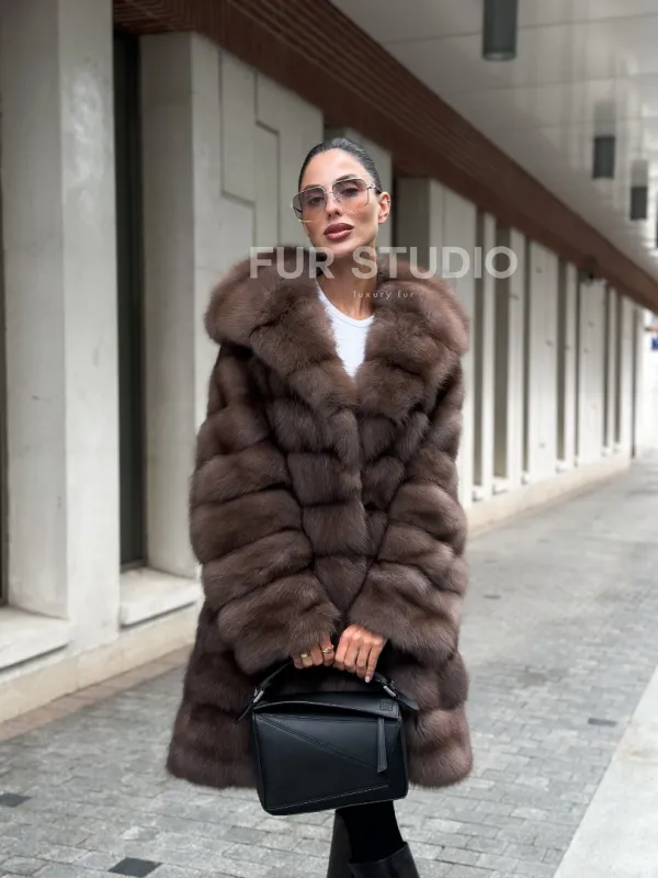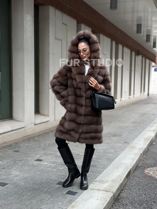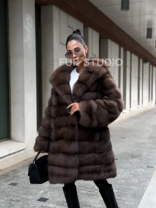 Шуба из меха куницы с капюшоном цвет трюфель 100997